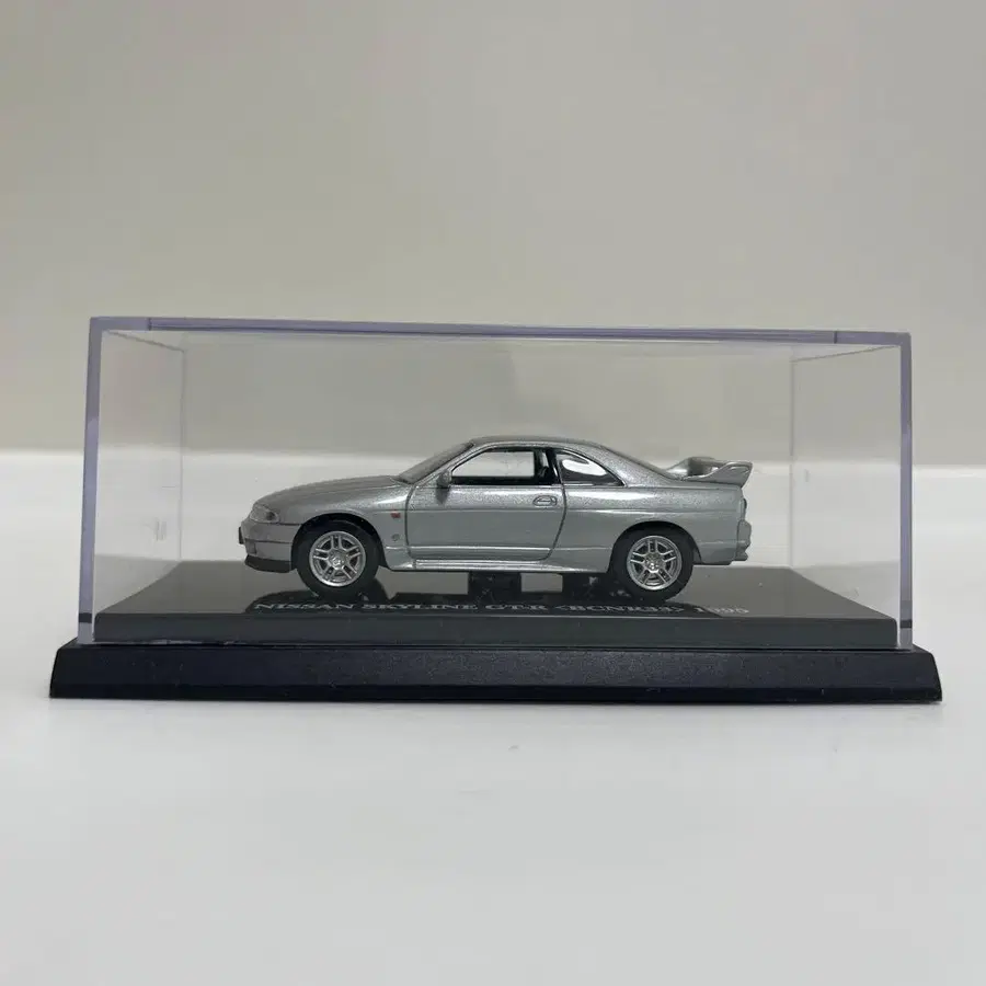 교쇼 R33 GTR 1/64 모델입니다. 케이스 위에 구매 시 생긴 것으로 생각되는 테이프 자국이 있지만, 본체는 색바램 없이 전체적으로 깨끗합니다.