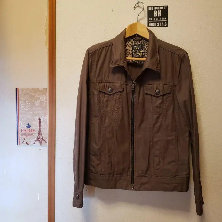 레오파드 무늬 안감이 특징인 브라운 집업 자켓.