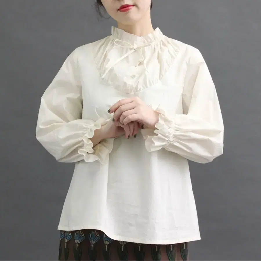 클래시컬한 스탠드 프릴 카라가 포인트. 원단을 넉넉하게 사용한 프릴 블라우스.