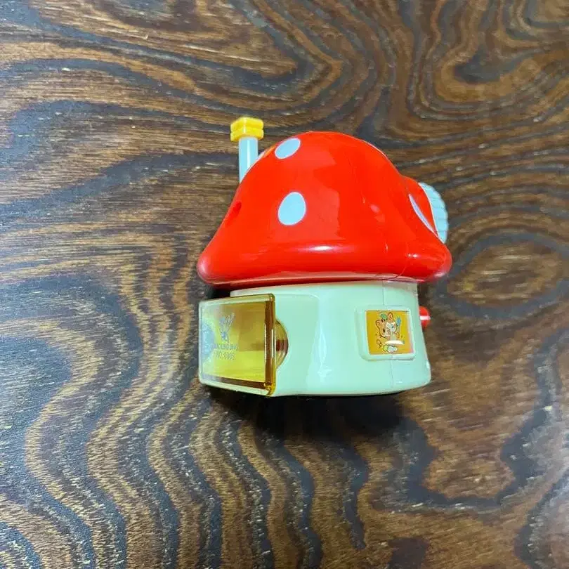 빨간색 버섯 모양 캐릭터 연필깎이, 화이트 물방울 패턴과 핸들 포함.