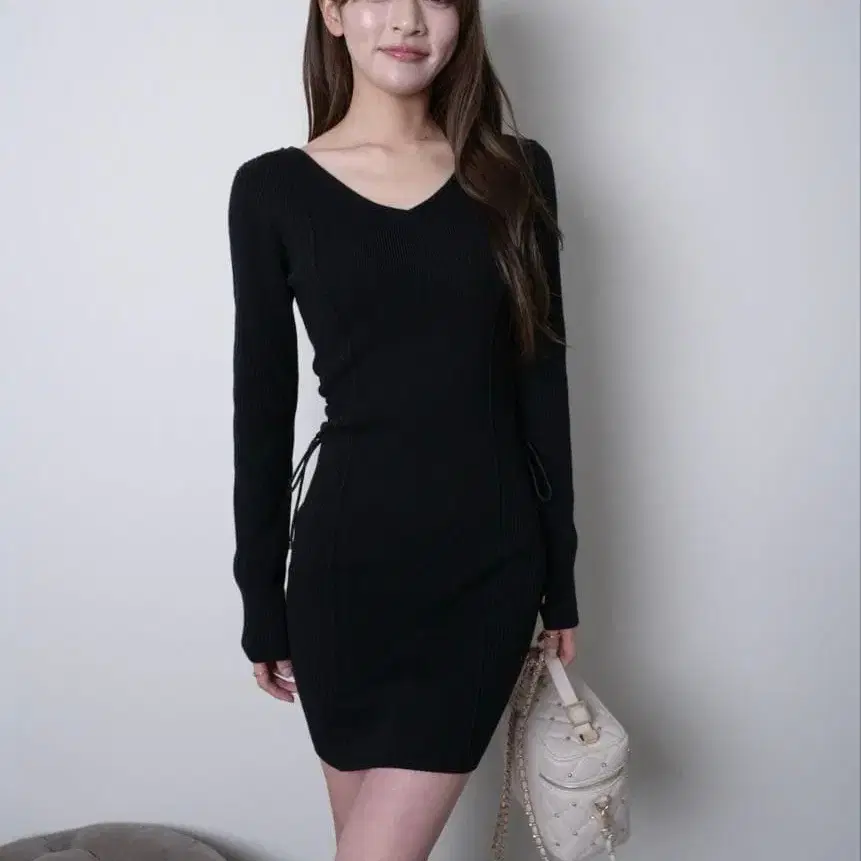 블랙 V넥 타이트 원피스 프리 사이즈
