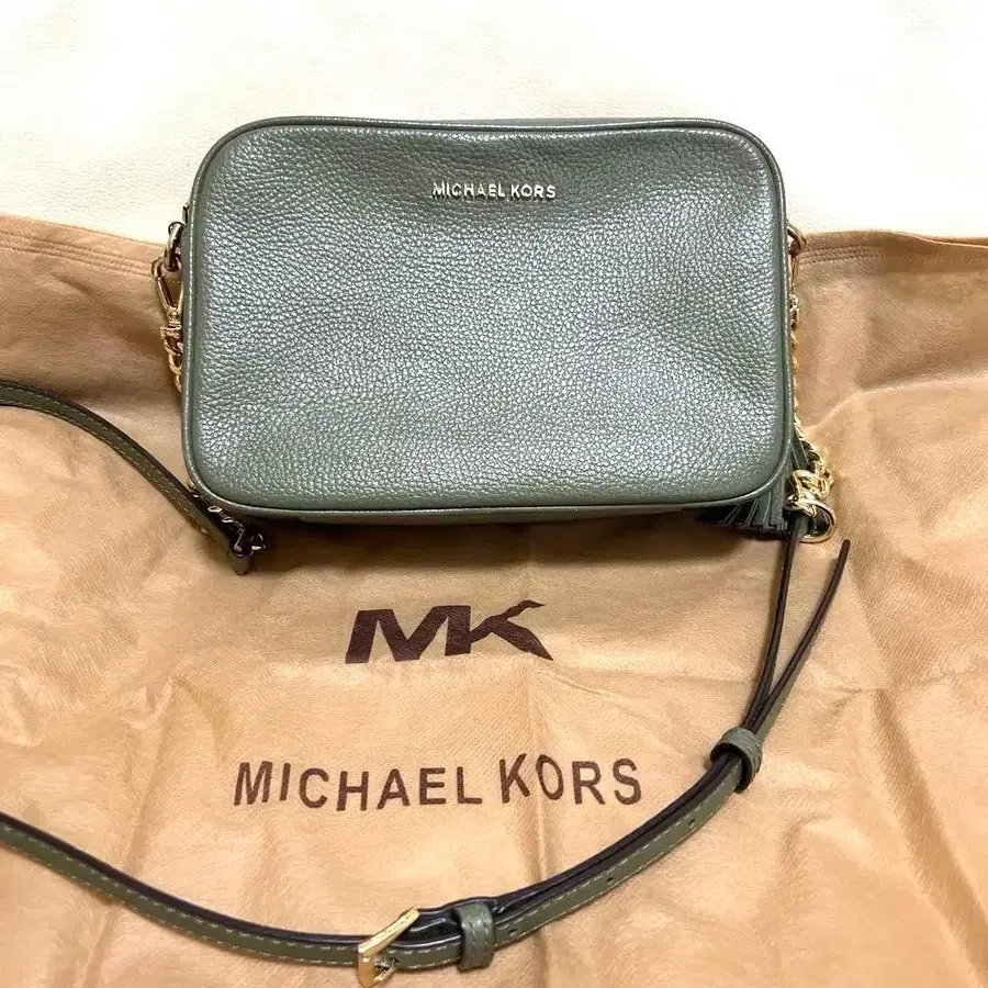 그린 색상의 가죽 숄더백, 태슬 장식으로 스타일리시합니다.