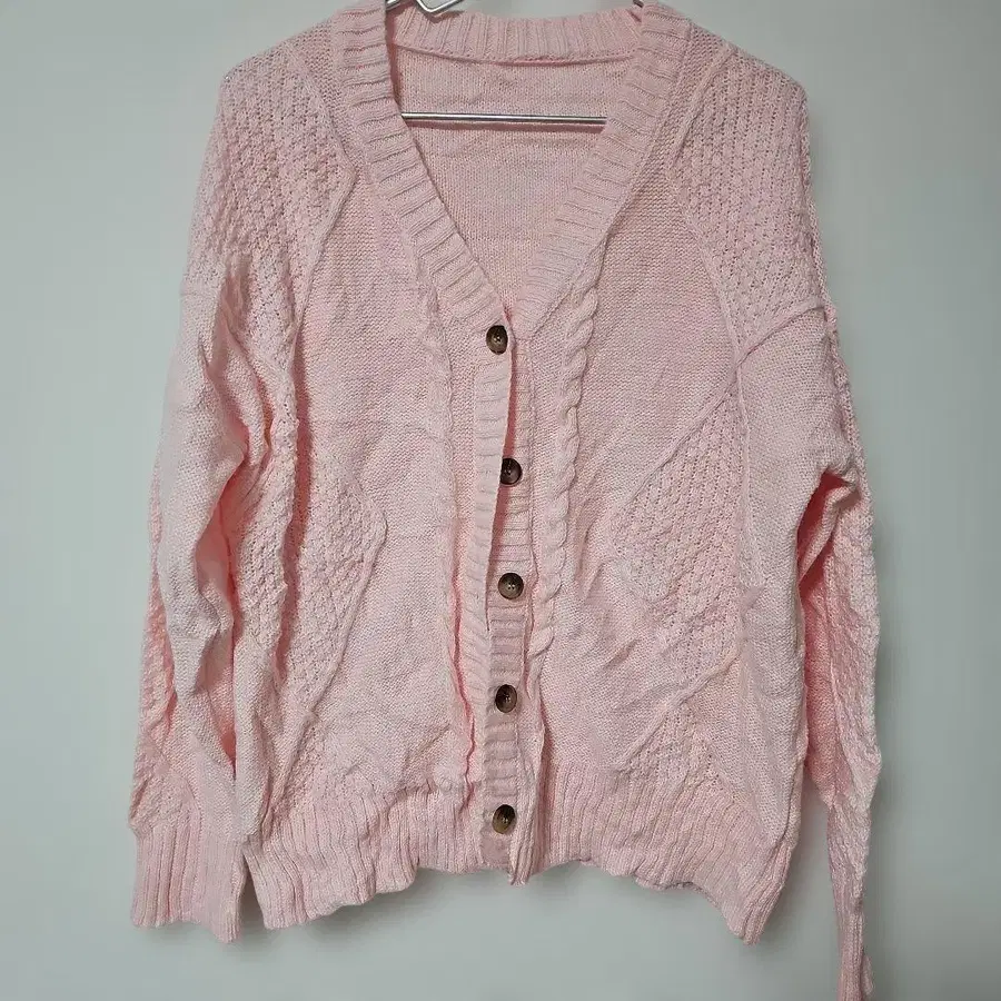 자동 번역되었어요. 원문보기케이블 짜임 디자인의 핑크 가디건, M 사이즈, 100% 폴리에스테르 소재.