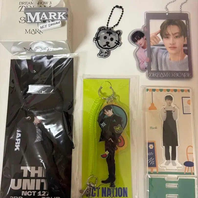 마크 아크릴 스탠드와 키링 세트, 트레이딩 카드 케이스, 응원봉 액세서리 세트입니다. 모든 상품은 공식 상품입니다. 아크릴 스탠드를 제외하고 라이브에서 한 번 사용했습니다. 그룹명 - NCT 그룹 멤버명 - 마크