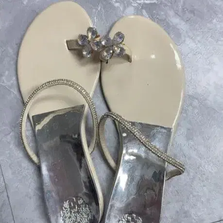 비쥬 장식의 베이지 샌들, 플랫 밑창으로 쾌적한 착용감. - 색상: 베이지 - 장식: 비쥬 장식 - 소재: 합성 피혁 - 밑창: 플랫 밑창 방문해 주셔서 감사합니다. 사이즈 - 22.5cm