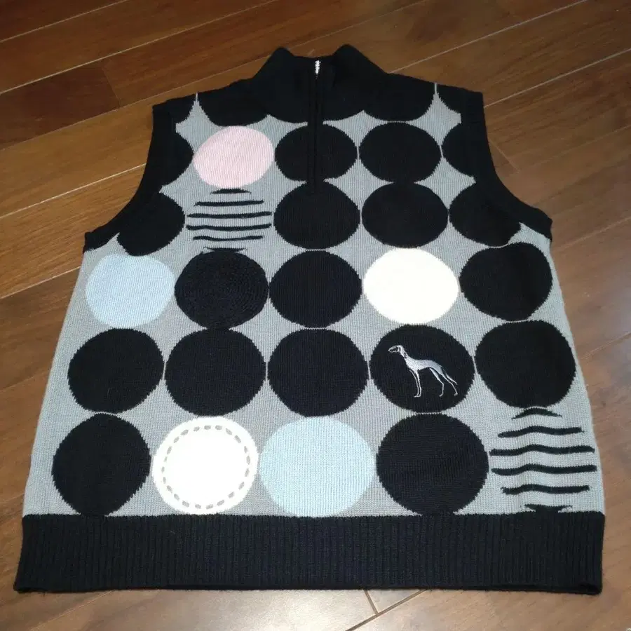 도트 무늬와 강아지 자수가 특징인 하프 지퍼 베스트. - 디자인: 도트 무늬 ( 블랙, 화이트, 핑크, 파랑 ) - 지퍼: 하프 지퍼 - 자수: 강아지 자수 ( 그레이 ) 미사용 상태로 보관했지만, 약간의 보풀 등이 있을 수 있습니다. 접힌 자국은 양해 부탁드립니다.