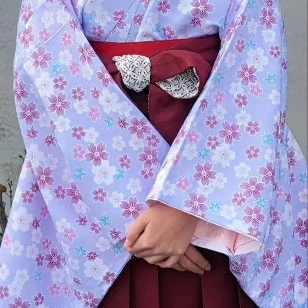 연보라와 핑크 꽃무늬가 특징인 하카마 스타일의 기모노. 3세트