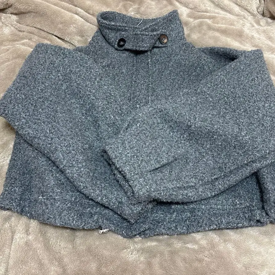 울 느낌의 그레이 숏 자켓, 스탠드 카라와 포켓이 부착되어 심플하면서도 스타일리시한 디자인입니다.