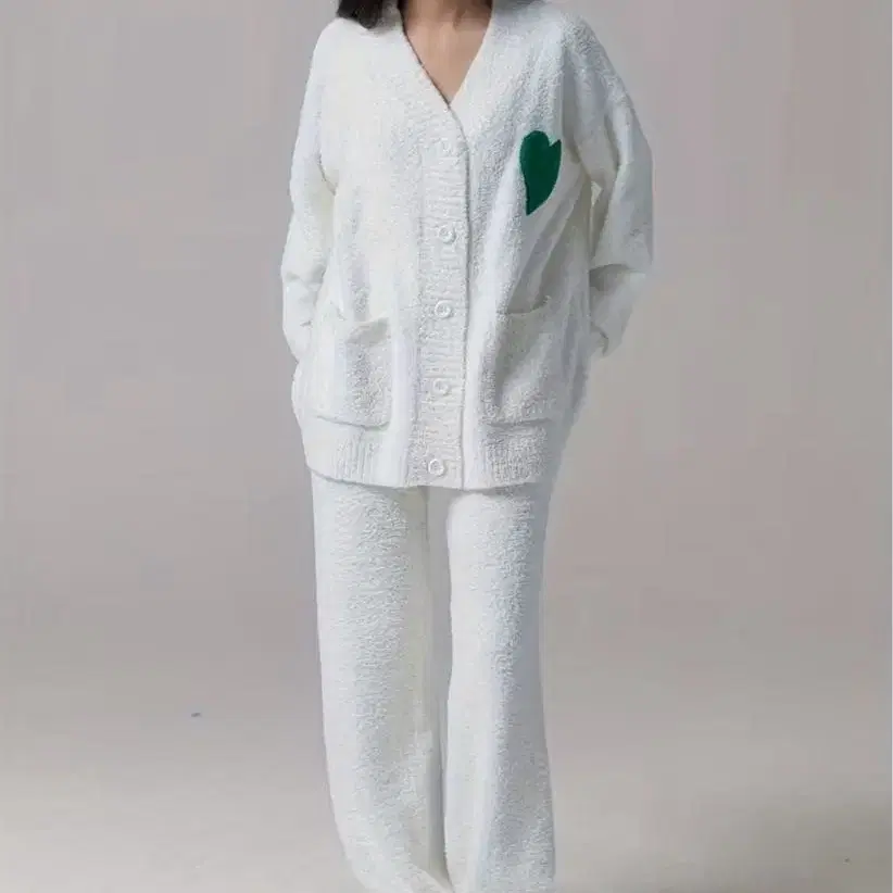 보아 소재의 화이트 룸웨어 세트, 하트 모양 포켓 부착.