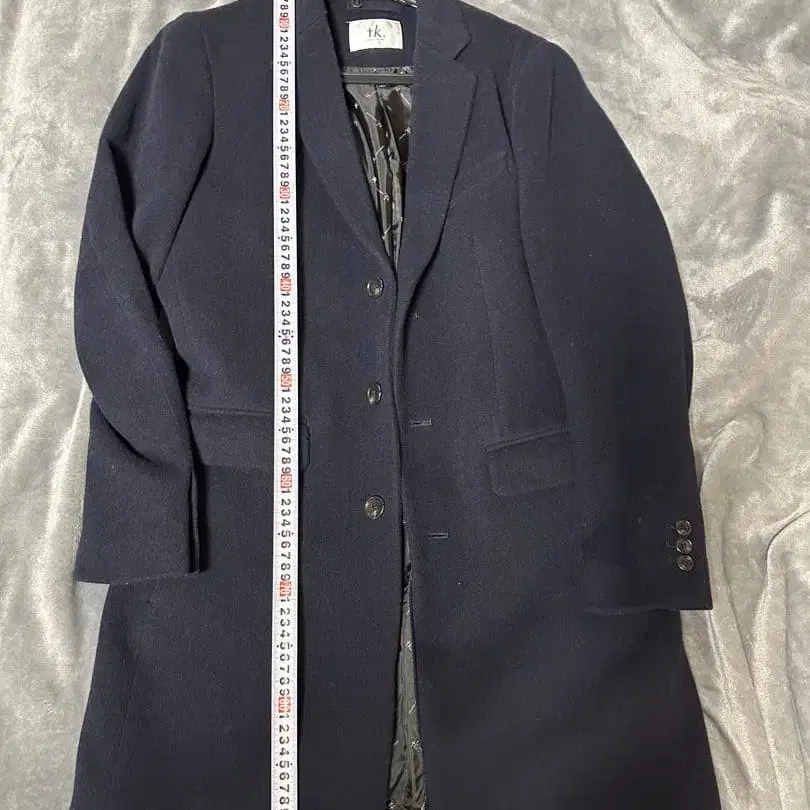 네이비 롱 체스터 코트, 안감에 별 패턴 디자인.