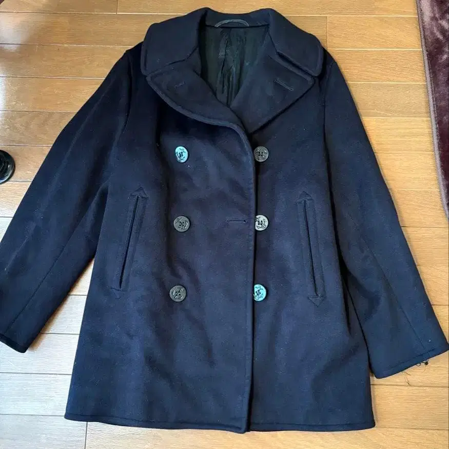 자동 번역되었어요. 원문보기네이비 더블 브레스트 피 코트, 사이즈 38, 소매에 데미지 있음.