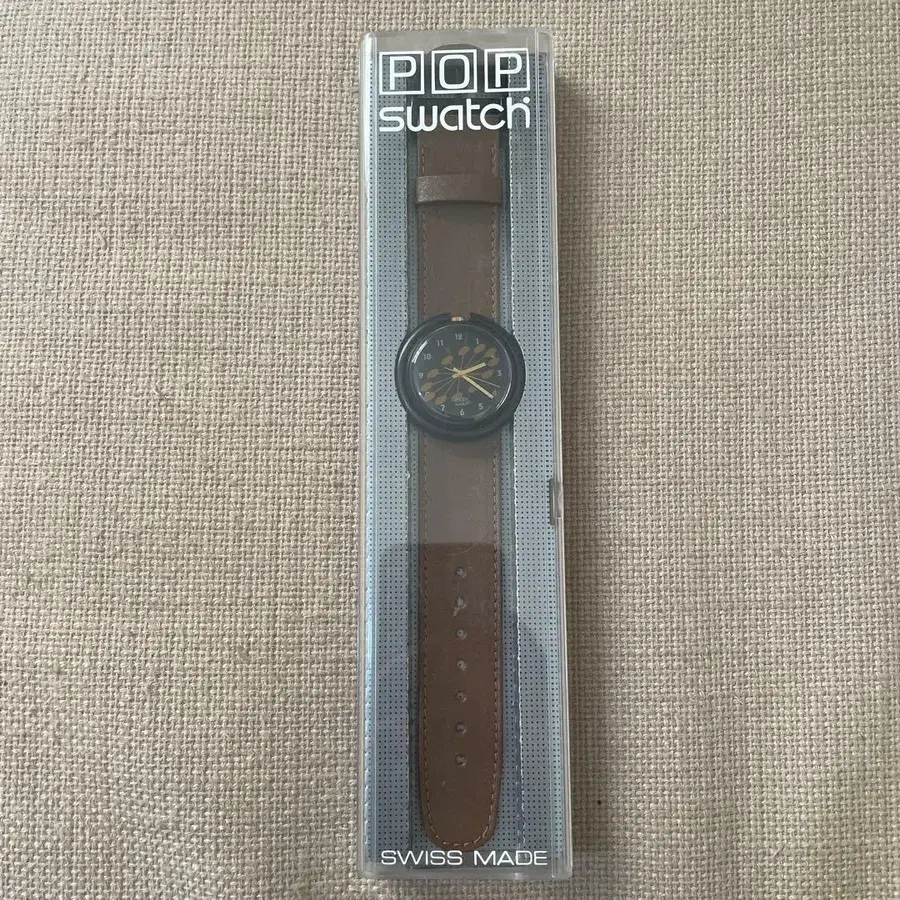 자동 번역되었어요. 원문보기스위스산 POP 스와치, 블랙과 브라운의 가죽 스트랩, 아날로그 다이얼.