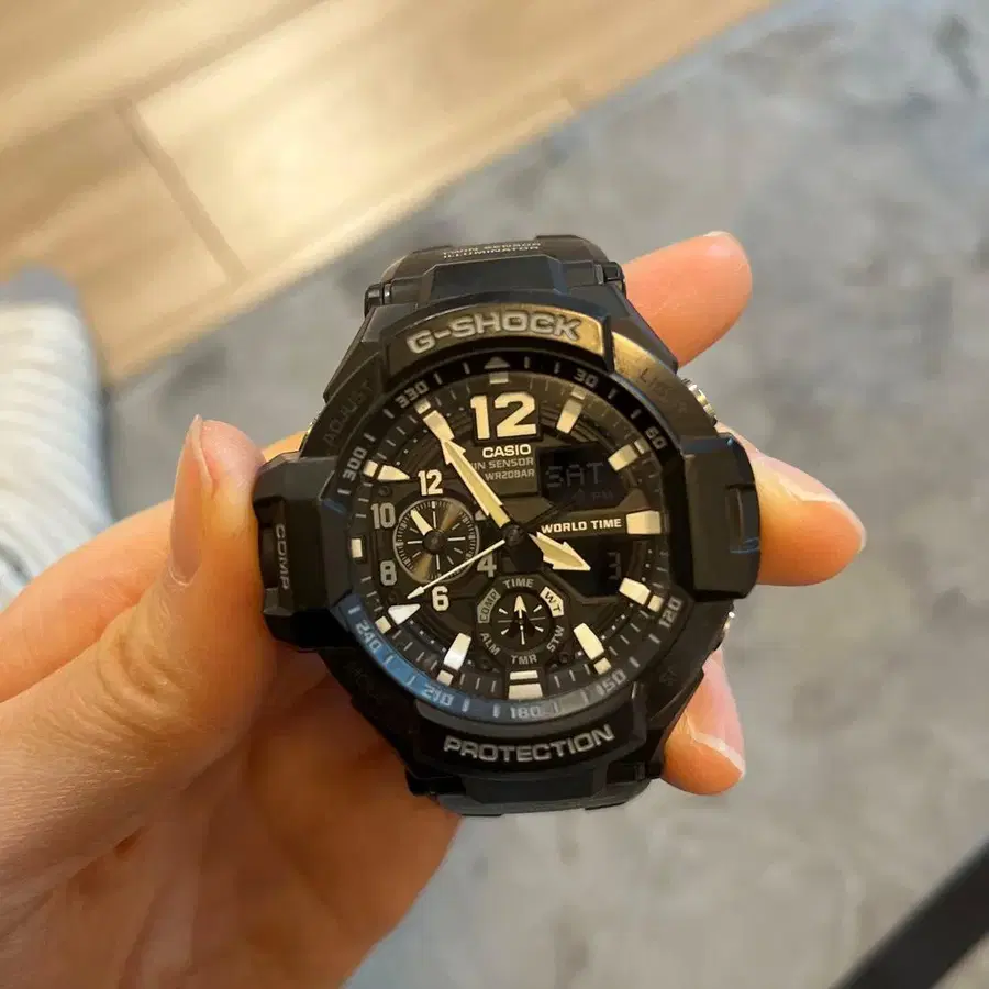 G-SHOCK의 블랙 모델, TWIN SENSOR 기능 탑재로 내충격성이 뛰어난 디자인. - 브랜드: CASIO - 모델: G-SHOCK - 기능: TWIN SENSOR, ILLUMINATOR - 색상: 블랙 - 보호 기능: PROTECTION 중고품에 동의하시는 분만 부탁드립니다. 방문해 주셔서 감사합니다.