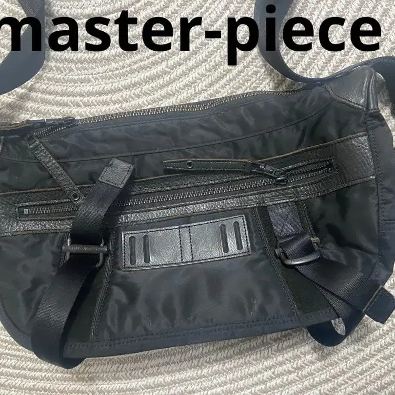 블랙 색상의 나일론과 리얼 가죽 숄더백, 조정 가능한 스트랩과 여러 개의 지퍼 포켓이 있습니다.
