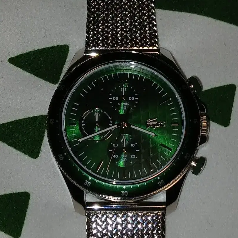 자동 번역되었어요. 원문보기그린 다이얼의 크로노그래프, 메쉬 밴드 포함.