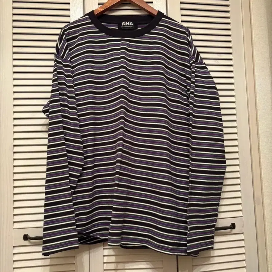 정가 8910엔 RNA 컬러 퍼플 사이즈 M 평평하게 놓았을 때 가슴 너비 67cm 평평하게 놓았을 때 기장 73cm 면 100 보더 롱 T입니다. 레이어드용으로도 좋습니다.