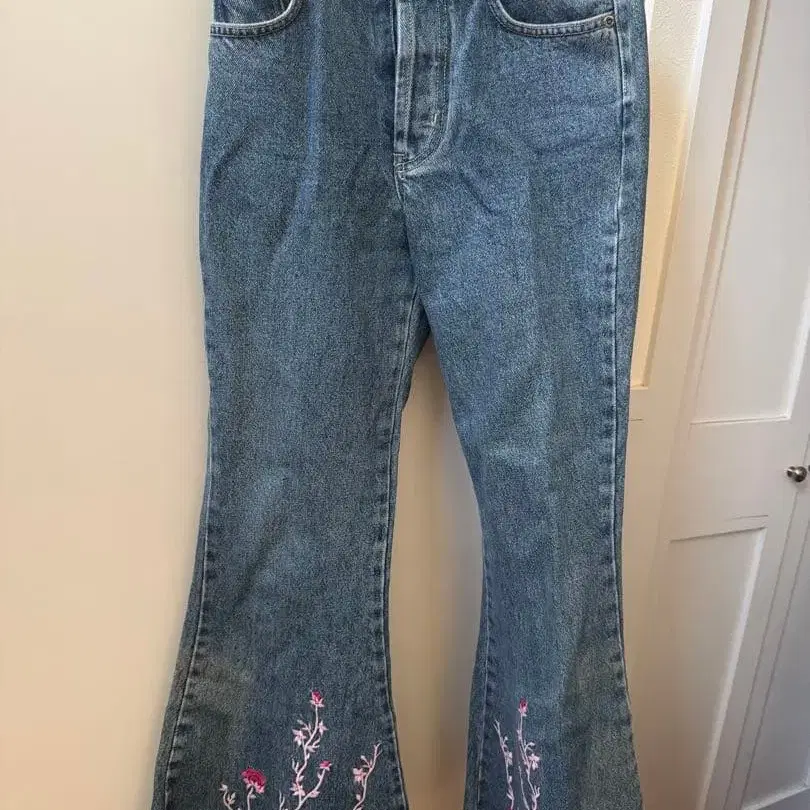 플레어 디자인에 핑크 꽃무늬 자수가 들어간 데님 팬츠입니다. 프랑스에서 구매한 구제 의류 매장에서 구입했습니다. 허리 단면: 약 31cm