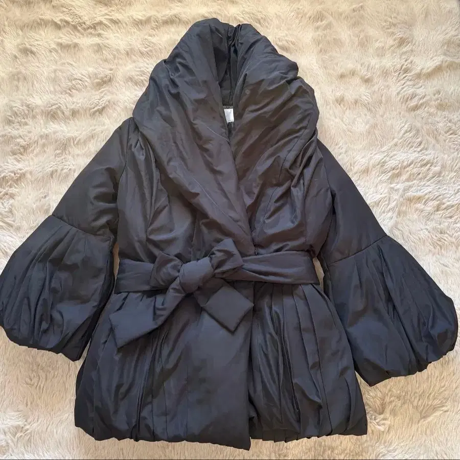 자동 번역되었어요. 원문보기볼륨 슬리브와 허리 리본이 특징인 블랙 다운 자켓.
