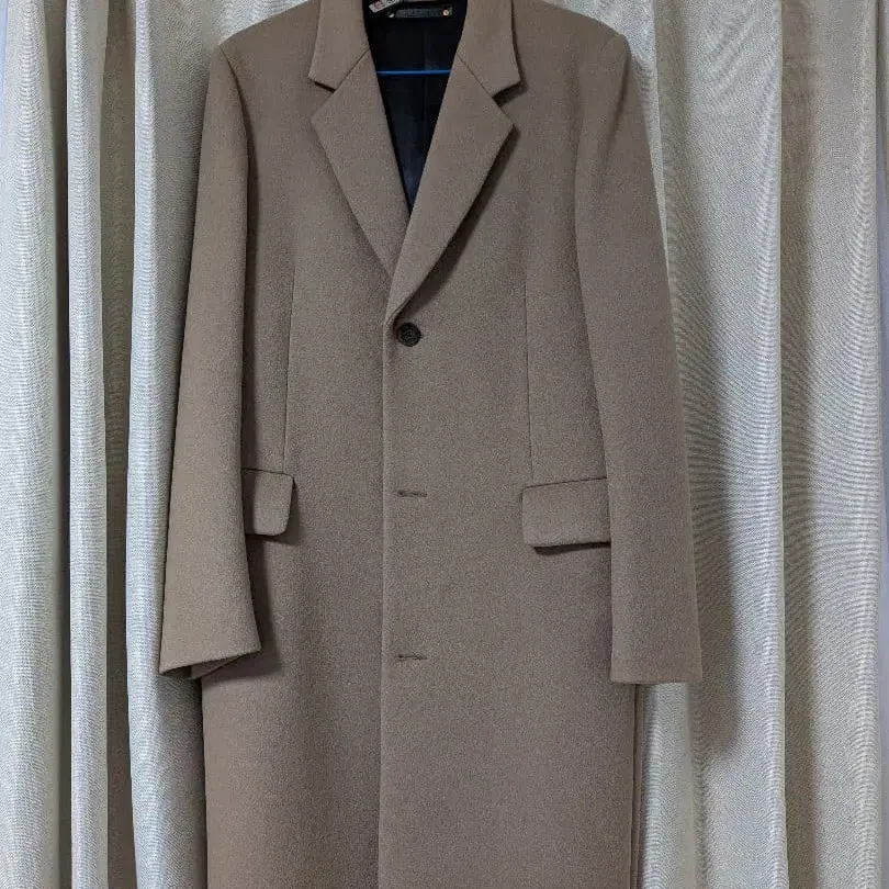 베이지 색상의 Paul Smith 체스터 코트입니다. 블랙과 오렌지 색상의 세련된 안감과 내부 포켓이 있습니다.