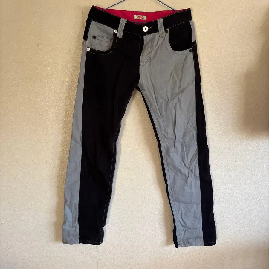 블랙과 그레이 컬러 콤비네이션 디자인의 슬림핏 팬츠. - 색상: 블랙, 그레이 - 브랜드: PMA - 디자인: 컬러 콤비네이션 - 스타일: 슬림핏 - 허리: 버튼 있음 - 포켓: 앞뒤 포켓 있음 방문해 주셔서 감사합니다.