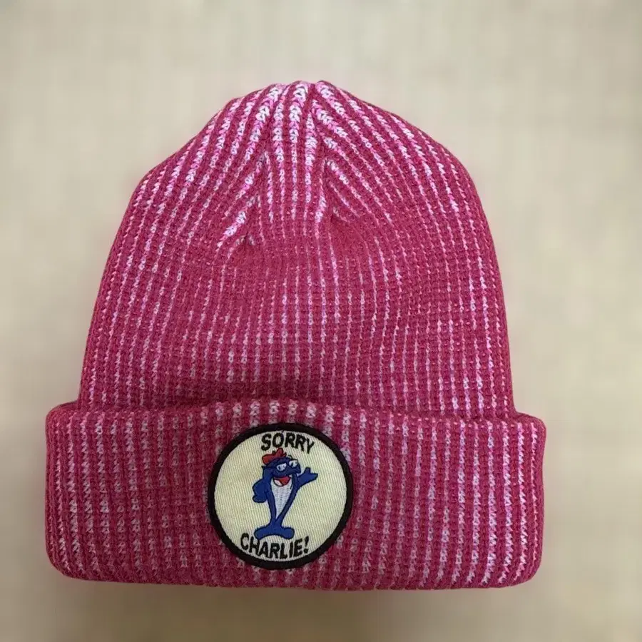 자동 번역되었어요. 원문보기선명한 핑크색 리브 니트 모자, Sorry Charlie! 자수 포함.