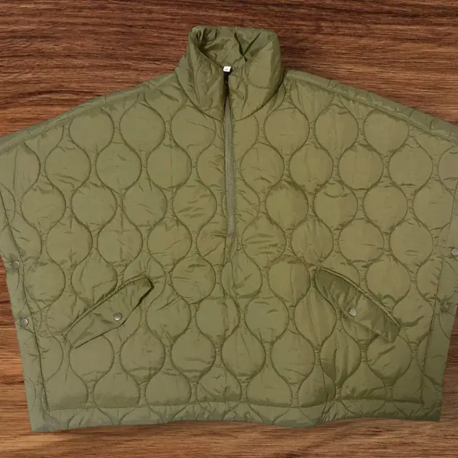 올리브 그린 색상의 퀼팅 디자인 나일론 베스트입니다. 프론트 지퍼가 있어 스타일리시한 아웃도어 스타일에 최적입니다. 사이즈는 S이지만 오버 사이즈입니다. 빅 포켓이 2개 있습니다.