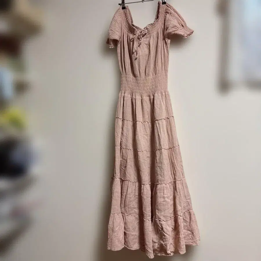 Muse by Rimo의 드레스입니다. 연한 더스티 핑크 색상이며, 오프숄더로 연출해도 귀엽습니다. 중고이며 사용감 있습니다.