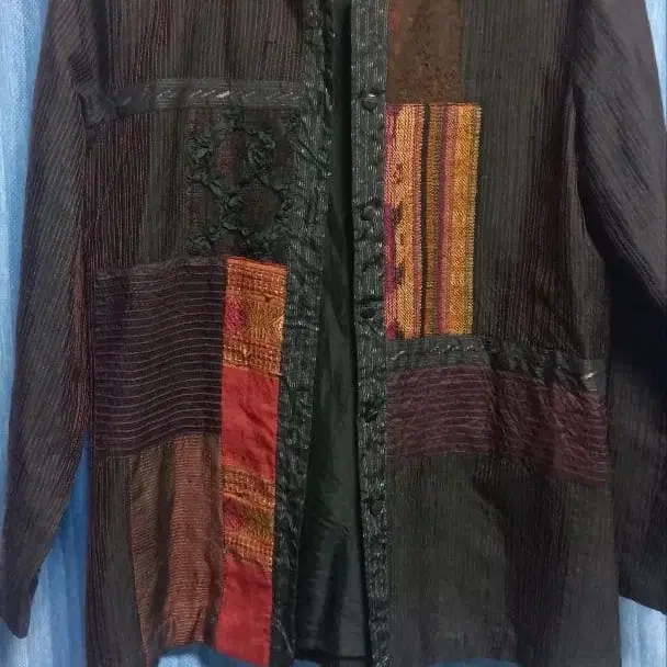 다양한 텍스처의 패치워크 디자인으로, 캐주얼한 에스닉 스타일의 노카라 자켓.