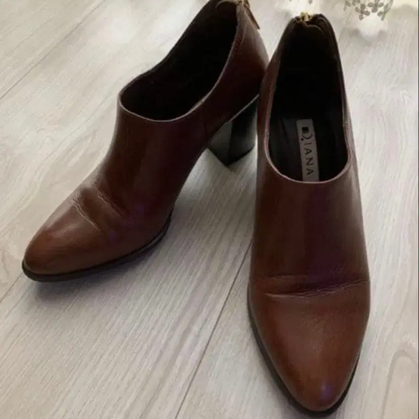 다이애나 부티 (23cm), 색상은 카멜입니다. 다이애나 전용 상자에 넣어 발송합니다. 착용 횟수가 적어 전체적으로 깨끗한 상태입니다. 힐은 7cm이지만, 와이드 디자인이라 걷기 편합니다.