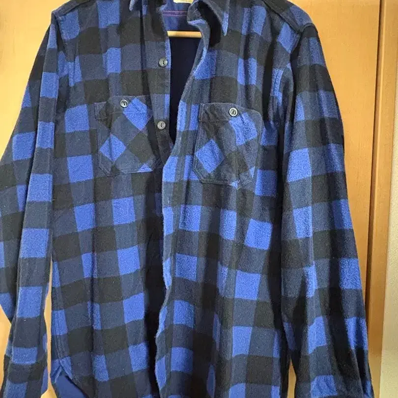 파랑과 블랙 체크 무늬의 플란넬 셔츠, L 사이즈, 버튼 달린 포켓 2개.