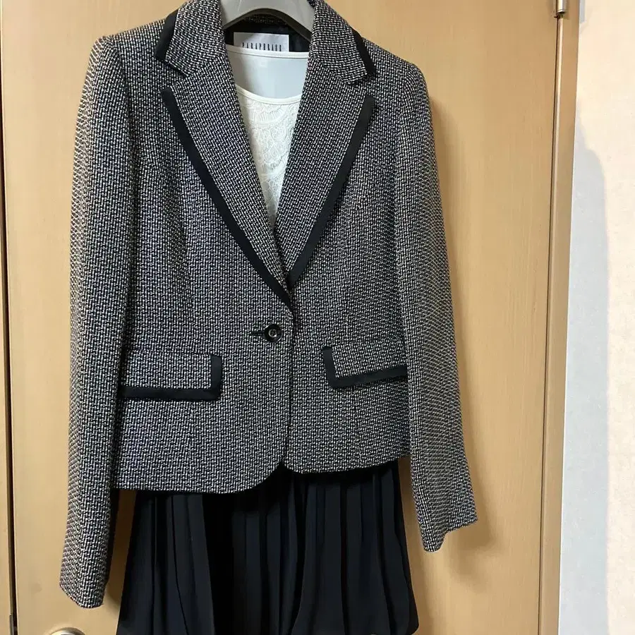 자동 번역되었어요. 원문보기블랙과 화이트 트위드 자켓, 레이스 장식의 화이트 상의, 블랙 플리츠 스커트 세트.
