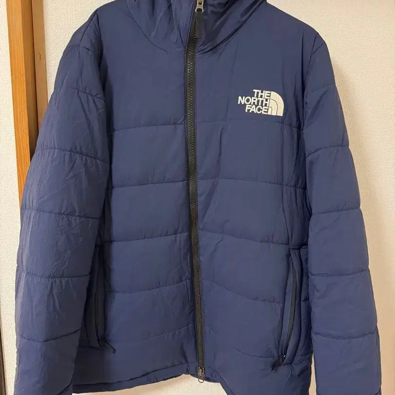 네이비 색상의 THE NORTH FACE 다운 자켓, 경량성과 보온성이 뛰어난 디자인.