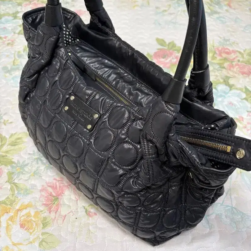 블랙 나일론 퀼팅 숄더백, 지퍼 포켓 부착으로 실용적입니다.