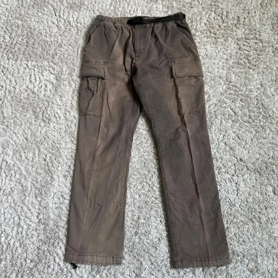 허리밴딩과 다기능 포켓을 갖춘 브라운 카고 팬츠.