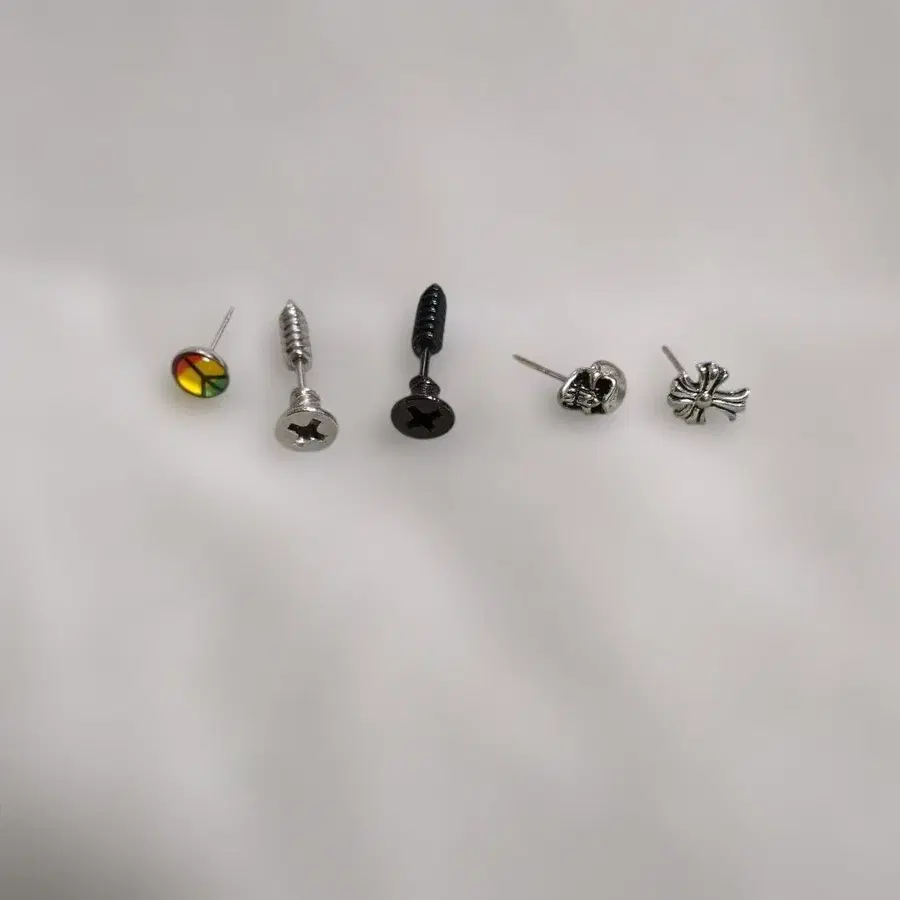 다양한 디자인의 귀걸이 5개 세트. - 디자인: 스컬, 크로스, 컬러풀한 디스크, 스크류형 등 다양한 디자인 - 색상: 실버, 블랙, 컬러풀 - 수량: 5개 세트 - 스타일: 유니크하고 개성 있는 스타일 방문해 주셔서 감사합니다.