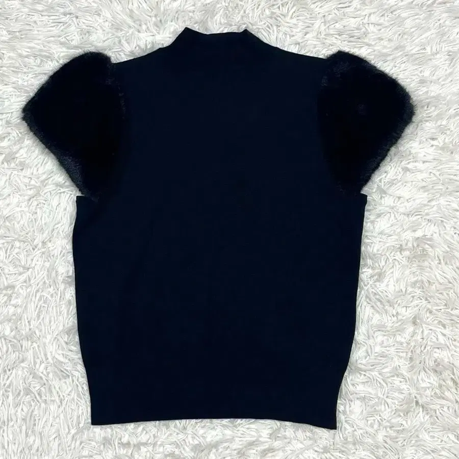 퍼가 달린 어깨 디자인이 특징인 블랙 반팔 니트탑입니다. 니트 부분은 실크 혼방으로, 부드러운 촉감과 함께 착용감이 좋습니다.
