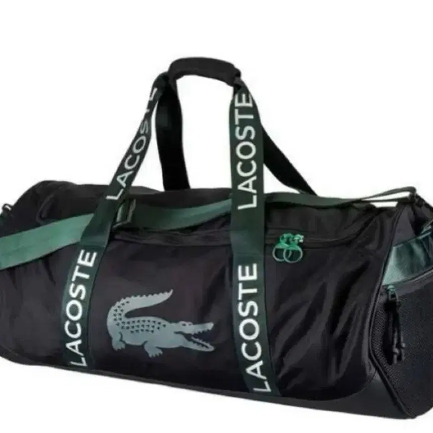 LACOSTE 로고가 새겨진 블랙 스포츠 백으로, 테니스 라켓 수납에 최적입니다.