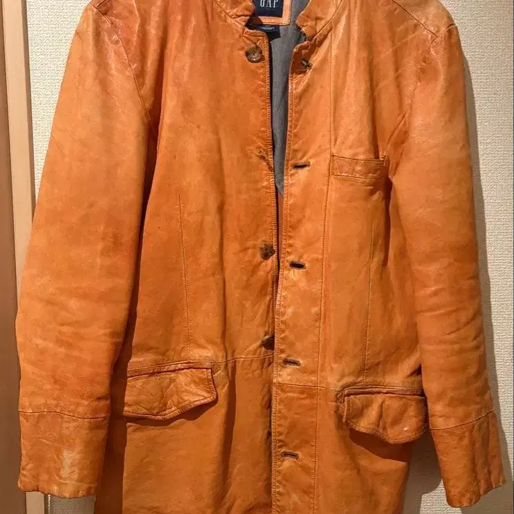 오렌지 컬러의 가죽 자켓, 단추식 디자인에 앞면에 포켓이 있습니다.