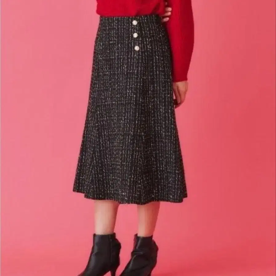 자동 번역되었어요. 원문보기블랙 플레어 스커트, 앞면에 버튼 3개, 트위드 원단으로 된 미디 기장.