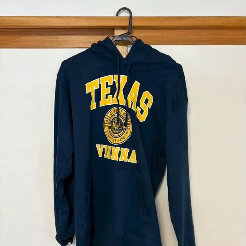 후드 부착 네이비 후드티, TEXAS VIENNA 프린트 디자인.