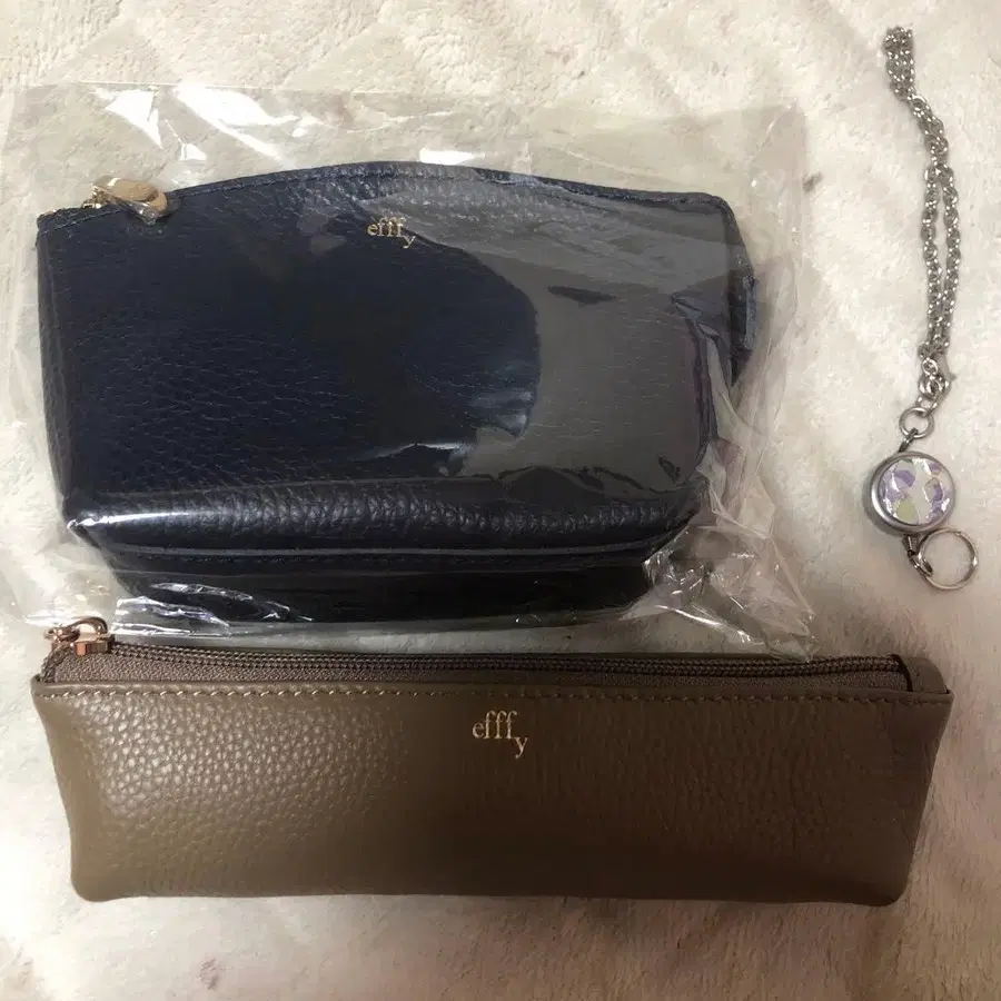 네이비와 골드 파우치 베이지 색상의 길쭉한 타입의 파우치 늘어나는 키체인 세트입니다. 엘레강트한 컬러입니다. 흡연자가 있습니다.