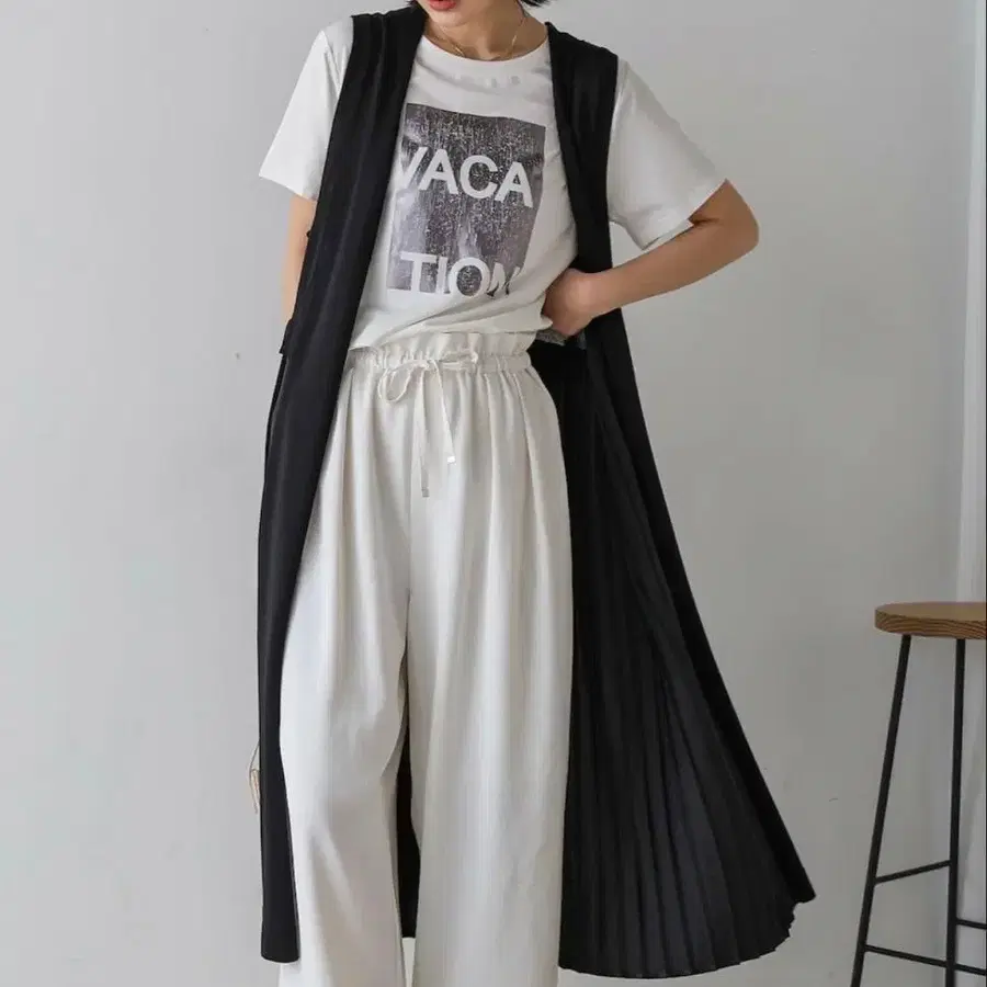매끄러운 니트의 짜임과, 플리츠 가공된 직물의 조합이 매력적입니다. 가벼우면서도 고급스러움도 겸비한 소재감.