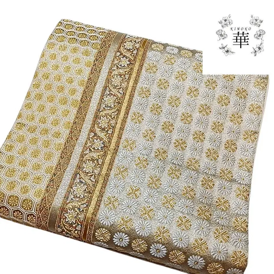 세로 줄무늬에 꽃무늬. 품격 있는 풍격에 골드 컬러 베이스의 멋진 오비입니다.