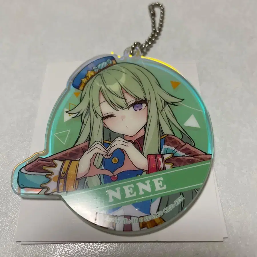 프로세카 NENE 아크릴 키링, 그린 컬러의 원형 디자인.