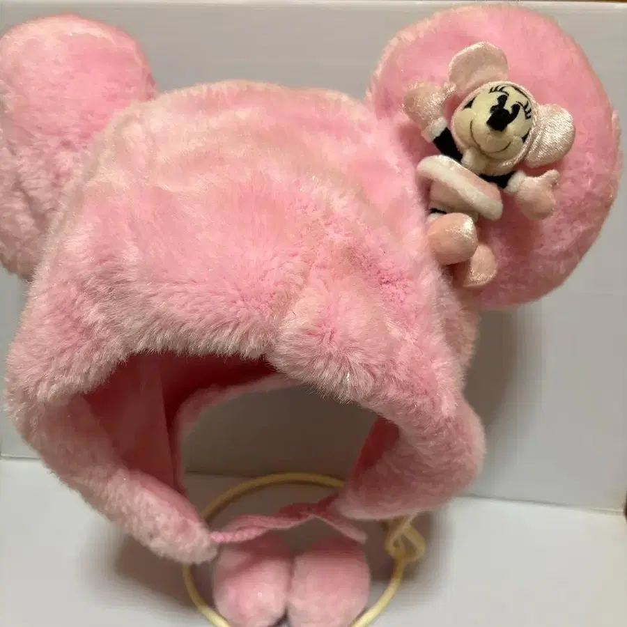 푹신푹신한 핑크 퍼와 미니 마우스 봉제 인형이 특징인 귀여운 모자입니다.