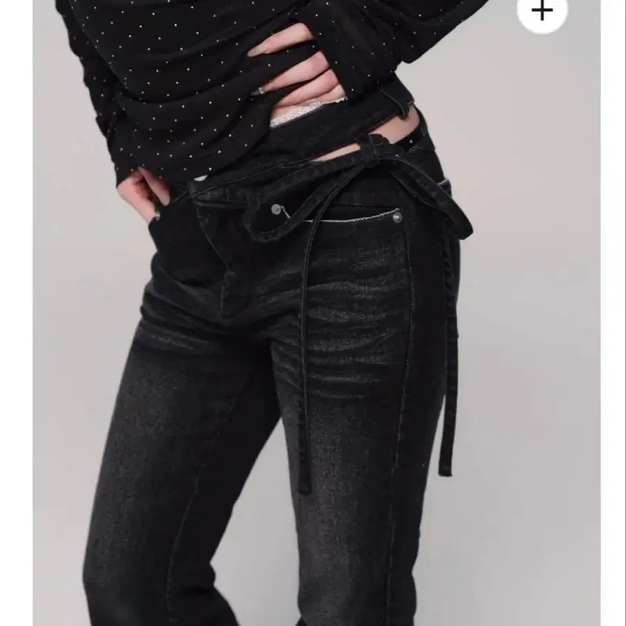 사이드 리본이 포함된 블랙 플레어 데님 팬츠.