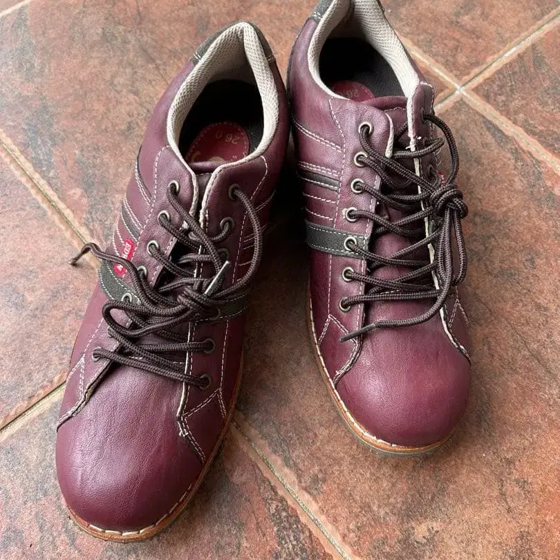 버건디 색상의 가죽 캐주얼 슈즈, 레이스업 디자인. 택 없이 미사용 상태입니다. - 색상: 버건디 - 소재: 가죽 - 밑창 디자인: 힐 포함, 트레드 패턴 - 스타일: 캐주얼 슈즈 - 특징: 레이스업, 사이드 스트라이프 방문해 주셔서 감사합니다. 사이즈 - 26cm
