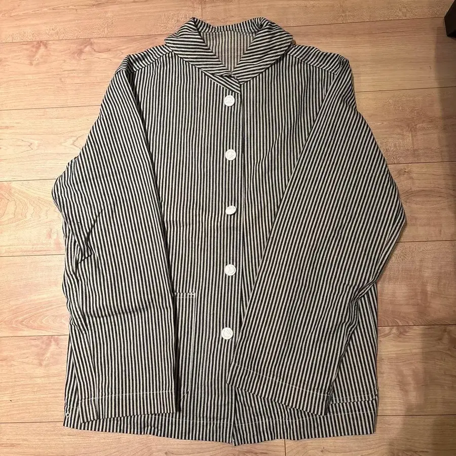 스트라이프 패턴의 커버올, 화이트 버튼과 접는 옷깃이 특징입니다. - 디자인: 스트라이프 패턴 - 버튼: 화이트 버튼 - 포켓: 앞면에 포켓 있음 - 옷깃: 접는 옷깃 방문해 주셔서 감사합니다. 사이즈 - XL(LL)
