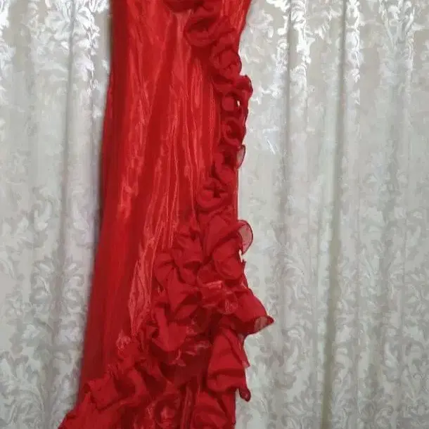 프릴과 꽃 장식이 특징인 빨간색 슬림핏 드레스. - 색상: 빨간색 - 디자인: 프릴 포함 - 장식: 꽃 모티브 - 스타일: 슬림핏 - 스트랩: 스파게티 스트랩 - 코사지, 스톨 포함 방문해 주셔서 감사합니다. 색상 - 레드 계열 얼룩, 찢김, 냄새 등 - 없음