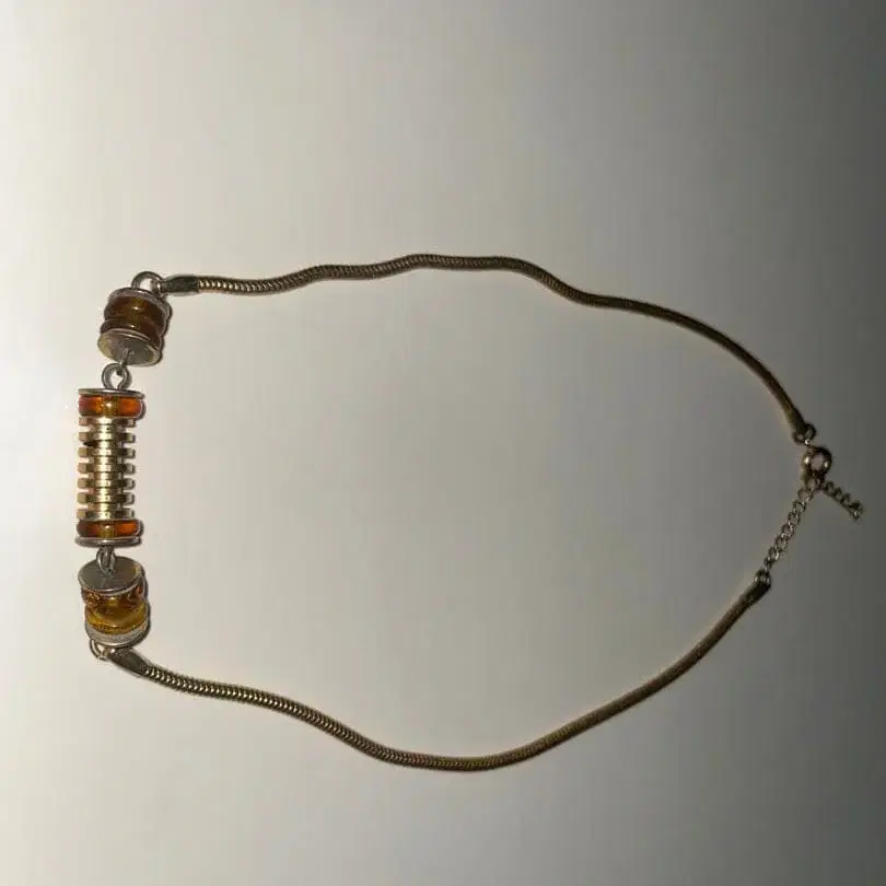 금속제 목걸이, 장식적인 비즈와 스프링 디자인이 특징입니다. - 디자인: 금속제 목걸이, 중앙에 장식적인 비즈와 스프링 모양의 부품이 배치되어 있습니다. - 길이: 약 40cm 방문해 주셔서 감사합니다.